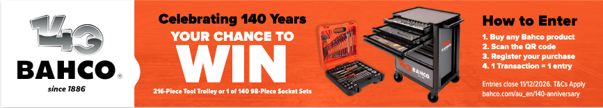 About the Bahco 140th Anniversary Bahco is celebrating 140 years with a giveaway running until December 11, 2026. Any Bahco purchase qualifies for entry to win a limited edition 216-piece tool trolley or one of 140 98-piece socket sets. Details at bahco.com/nz_en/140-anniversary.